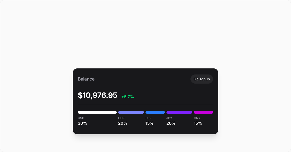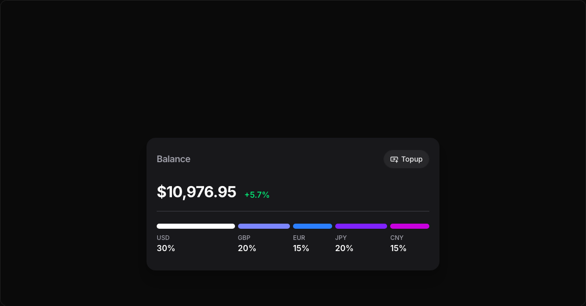 A sophisticated dark-themed balance card displaying multi-currency portfolio allocation. Features a segmented progress bar showing distribution across five currencies.