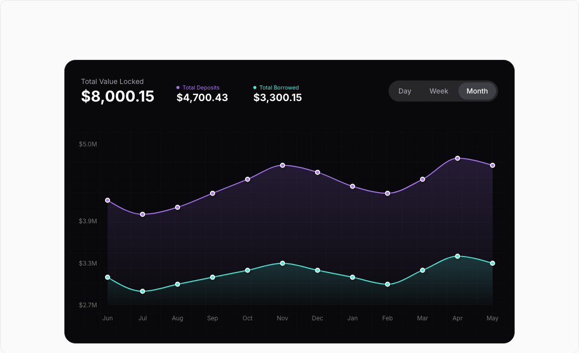 A sophisticated DeFi-style dashboard tracking Total Deposits against Total Borrowed amounts. Features dual gradient areas with line overlays and a dark theme optimized for crypto applications.
