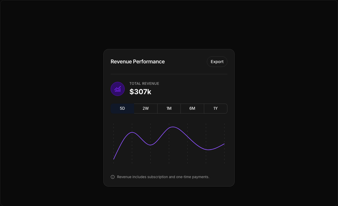 A stylish revenue visualization with an integrated toggle group for period selection. Features a clean design with chart icon, total revenue calculation, and smooth line animations.