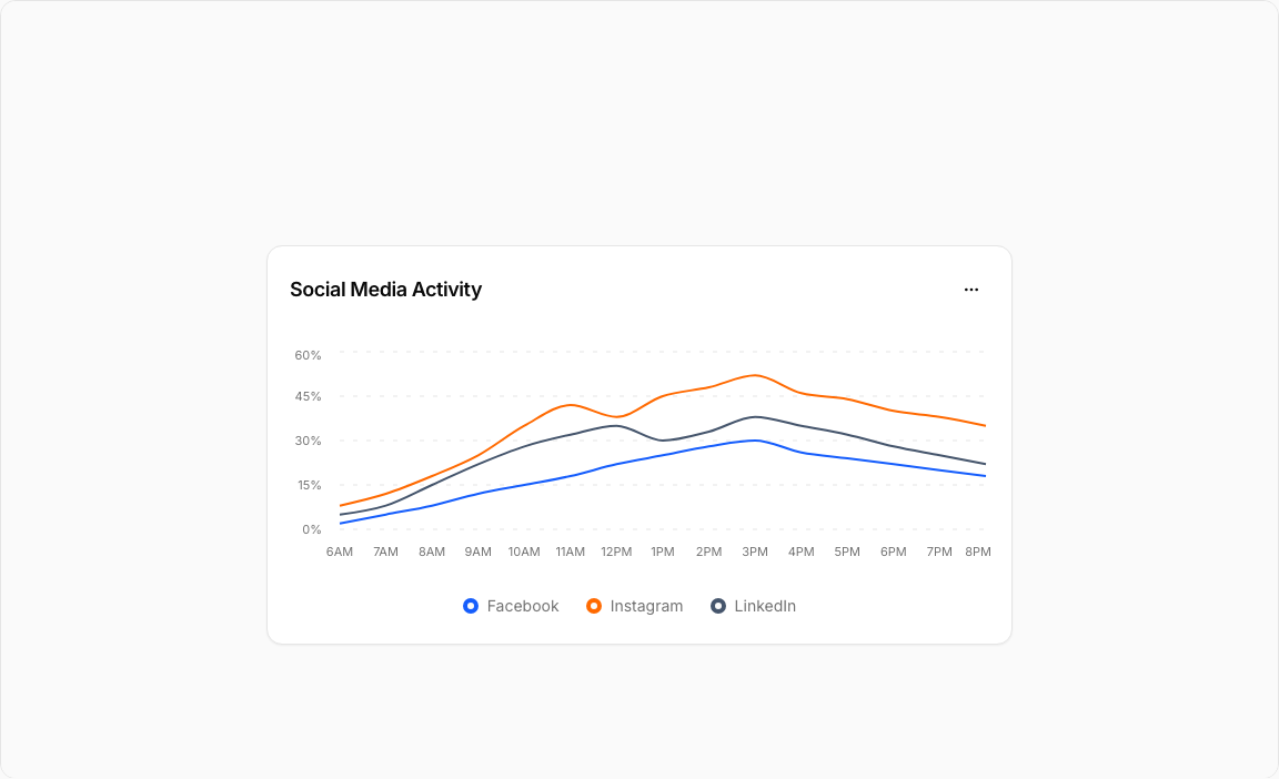 { time: "3PM", facebook: 30, instagram: 52, linkedin: 38 },